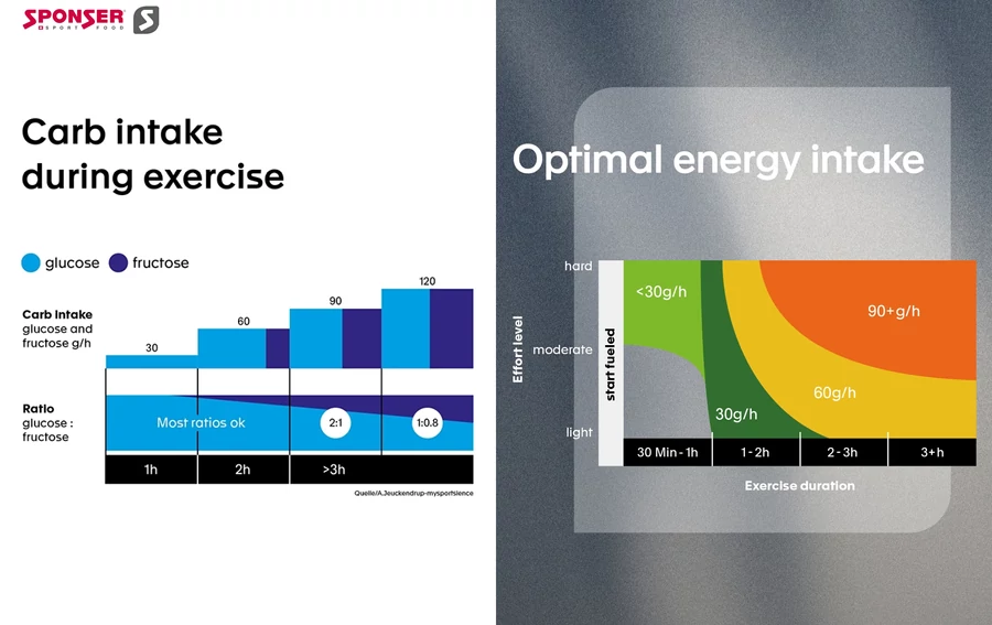 A válasz elsősorban az időegységre jutó teljes fogyasztott mennyiségtől, valamint a időtartamtól és az egyéni toleranciától függ. Nagyon hosszú vagy intenzív edzések során, amikor óránként több mint 80 g szénhidrátot kell fogyasztani, a glükóz önmagában gyorsan eléri felszívódási határértékét (kb. 60 g/h). Csak fruktóz hozzáadásával lehet ezt a határértéket 100 – 120+ g/h-ra növelni.